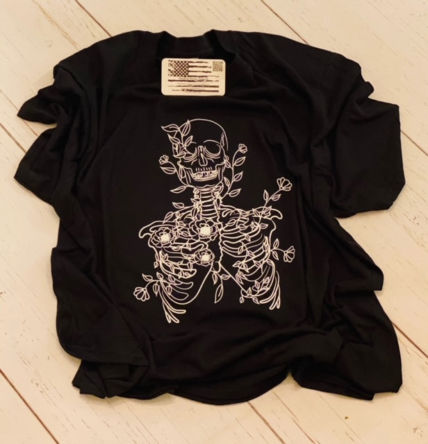 Conquer the world in style with this Floral Skeleton Soft-Style T-Shirt! Combining a classic skeleton structure with pretty flower accents, this shirt is perfect for making a statement of risk-taking and adventure. Show off your bold side now!